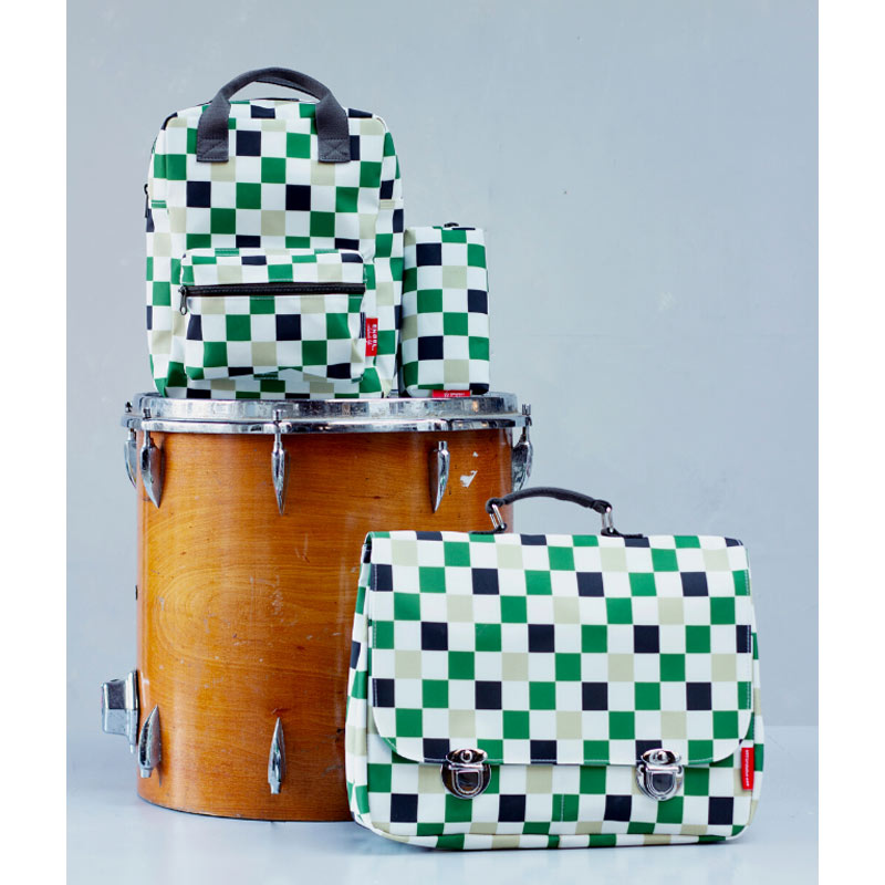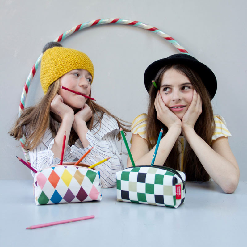 Trousse à crayons Motifs: Damier à carreaux, vert et blanc Dimensions: 21 cm x 8 cm x 8 cm Matériaux éco-responsable: Toile extérieure faite à partir de bouteilles recyclées Design: Engel Celebrate for Life, Pays Bas